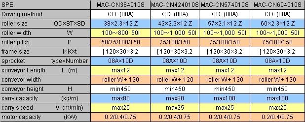 MAC-C series driving conveyorcan be driven by friction clutch ,rollers and chain can be moved relatively,the strength of the friction clutch can be adjusted to prevent the moving object stopping.