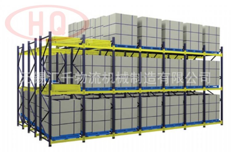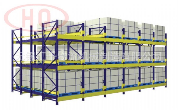 貨架是在前后梁間以多層臺車重疊相接,從外側將疊棧貨物置于臺車推入,后儲存之貨品會將原先貨品推往里面。