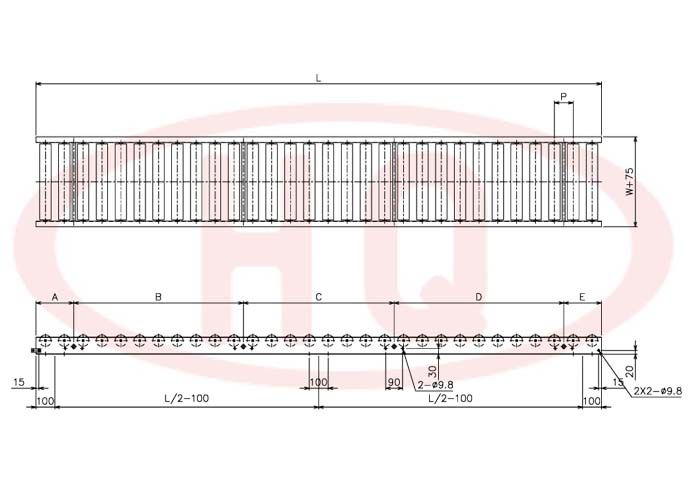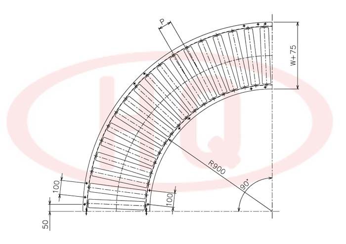 | 型 號 | 滾筒外徑(φ)×壁厚(t) 軸承 | 軸外徑(φ)×壁厚(t) 加工 | 支架形狀I(lǐng)×K×t 輸送機高(H) | 機 長 L | 滾筒 幅 寬 W | 滾筒間隔 P | 轉(zhuǎn)彎半徑 R | |||||||